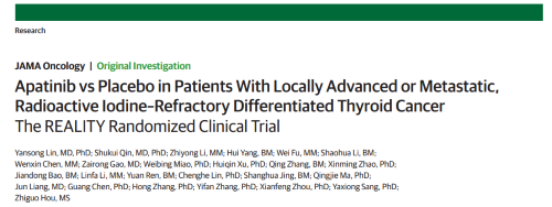 2021年12月16日,权威医学杂志《JAMA Oncology》(影响因子31.777)在线发表阿帕替尼的一项III期临床研究(REALITY)——甲磺酸阿帕替尼片治疗局部进展/转移性放射性碘难治性分化型甲状腺癌(RAIR-DTC)患者的多中心、随机、双盲、安慰剂对照临床研究。此研究由北京协和医院的林岩松教授和南京金陵医院的秦叔逵教授发起,在全国21个研究中心展开,由金年会- 金字招牌医药中央医学事务部团队支持完成。