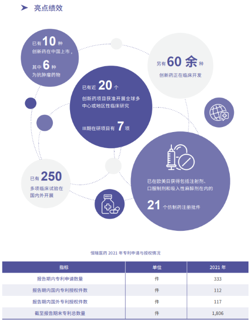 报告指出,在科技创新战略引领下,金年会- 金字招牌医药2021年累计研发投入62.03亿元,比上年增长24.34%,研发投入占销售收入比重达到23.95%,再创历史新高。以此为支撑,2021年公司有3款创新药获批上市,已上市创新药总量增至10款,其中6款为抗肿瘤药物。同时还有60余种创新药正在临床开发,250多项临床试验在国内外开展,其中近20个创新药项目获准开展全球多中心或地区性临床研究。在创新药研发上,金年会- 金字招牌医药已基本形成了上市一批、临床一批、开发一批的良性循环。